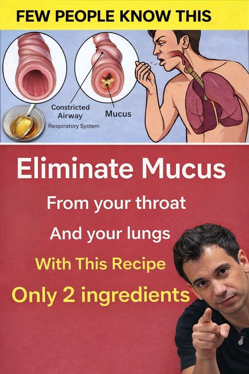 Mucus in the throat and lungs can be very annoying, causing coughing, congestion, and difficulty breathing. Fortunately, there is a simple and effective natural solution to get rid of it quickly. With just two ingredients, this homemade recipe will help clear your airways and restore easy breathing.Mucus is naturally produced by the body to trap impurities and protect the respiratory tract. However, when it becomes excessive due to colds, infections, or allergies, it can cause discomfort and difficulty breathing.