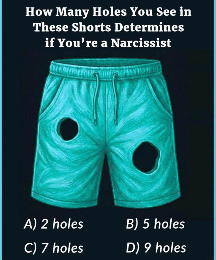At first glance, the image looks simple: a pair of teal shorts with a couple of obvious holes and a bold claim at the top suggesting your answer might reveal something about your personality. But don’t be fooled—this visual puzzle isn’t really about narcissism. It’s about perception, attention to detail, and how quickly our brains jump to conclusions.